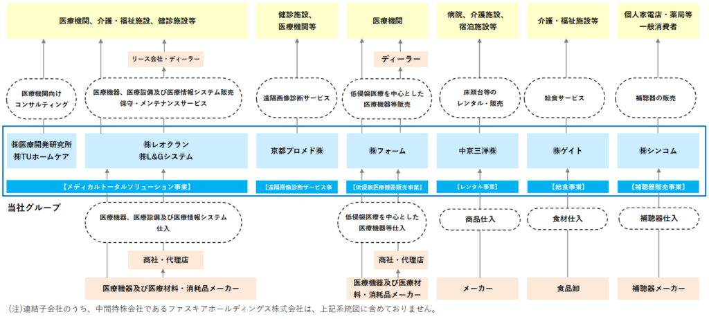 具体的には、医療機関や福祉施設等の新築、増改築、移転等のプロジェクトの根幹に係わる重要なファクターとなる医療機器、医療設備、医療情報システム等の選定から活用、施設の運営を展望して、設計段階からの技術支援、プロジェクト全体の予算管理と開業までのスケジュール管理をワンストップで提供する「トータルソリューション事業」を展開し、顧客との信頼関係を構築して、医療機器、医療設備、医療情報システム及び医療材料・消耗品の販売を行っております。また、保守・メンテナンスサービスといった、長期的サービスの提供も行っております。